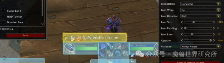 缺乏冷却信息,无法判断技能是处于可用状态,还是已用于其他队友。与 “冷却管理器”类似,增益效果会重复显示 —— 既出现在常规 buff 框架中,也会显示在额外保命监控框架里。