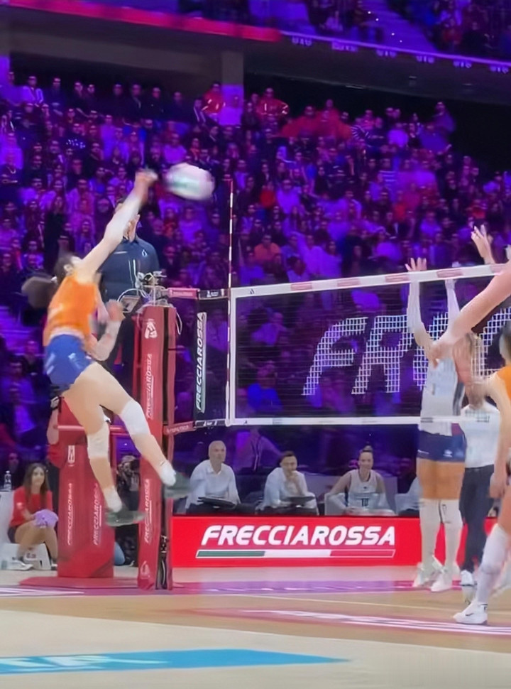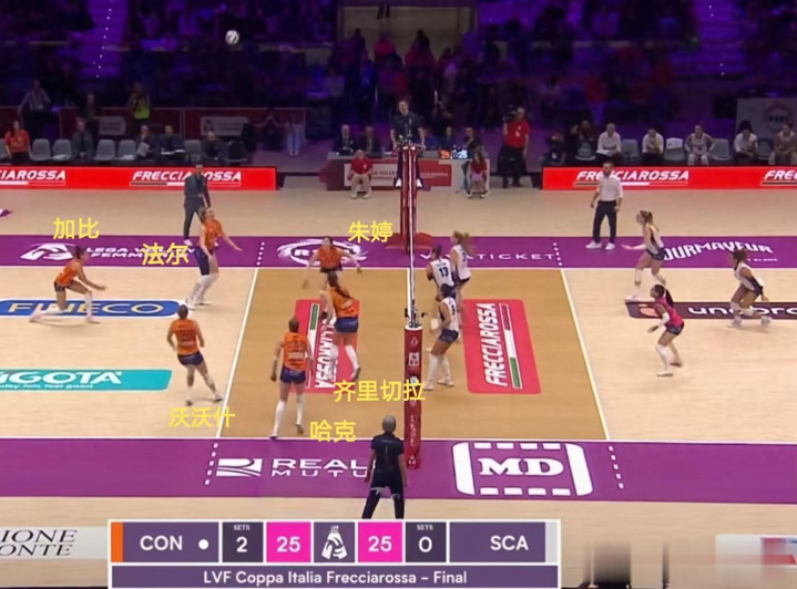 手忙脚乱的沃沃什还没把球撩起来,朱婷就已经开始后撤步,好像准确预判了小妈会把球撩到哪个位置。