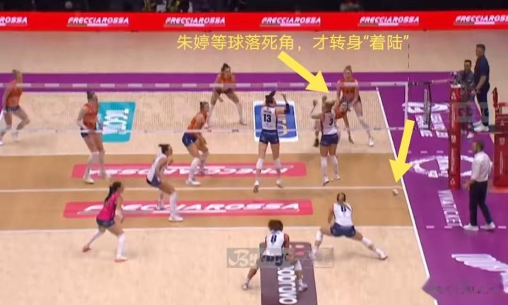 其实没有人有这么神的预判,朱婷当时只是在下意识地启动,想回到自己4号位的攻击位置。但球在空中转换方向、飞舞的速度太快,朱婷根本来不及转身,只能后撤步归位。